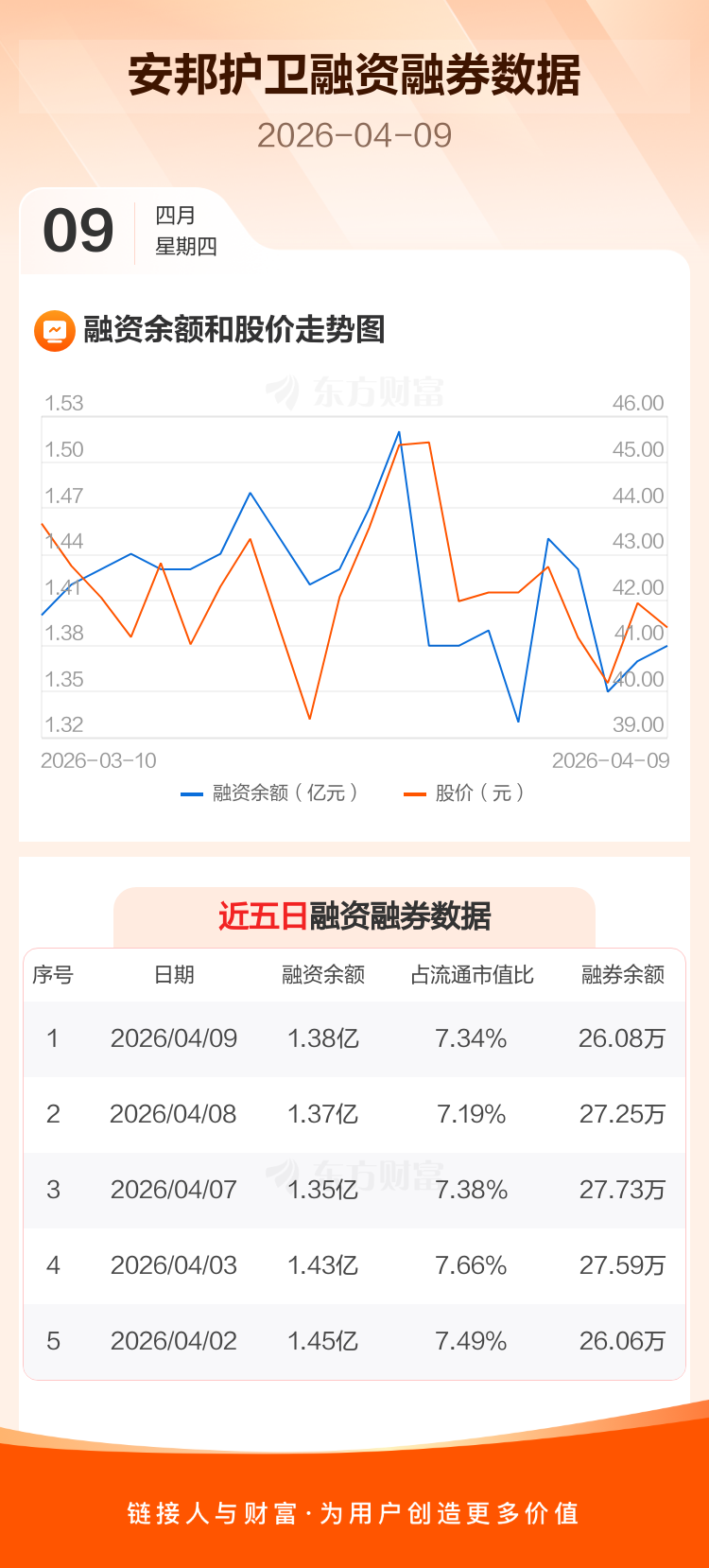 交易所最新数据显示,安邦护卫于2026年4月9日获融资买入757.61万元,融资偿还636.10万元,当日融资净买入121.5万元。目前,该股融资余额1.38亿,占流通市值比例为7.34%。