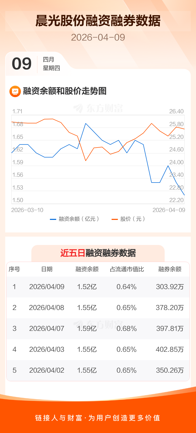 交易所最新数据显示,晨光股份于2026年4月9日获融资买入268.99万元,融资偿还564.70万元,当日融资净偿还295.71万元。目前,该股融资余额1.52亿,占流通市值比例为0.64%。