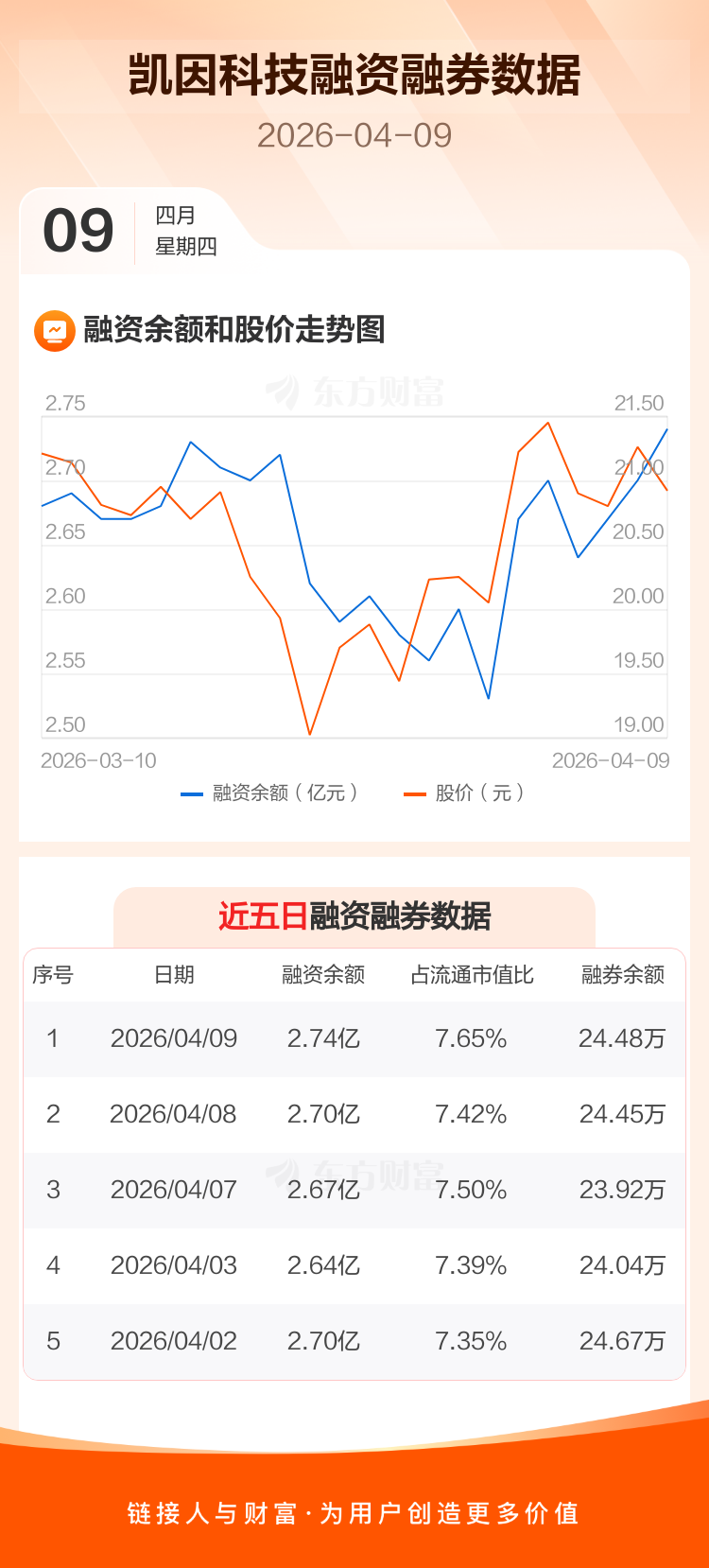 交易所最新数据显示,凯因科技于2026年4月9日获融资买入1355.43万元,融资偿还979.90万元,当日融资净买入375.53万元。目前,该股融资余额2.74亿,占流通市值比例为7.65%。
