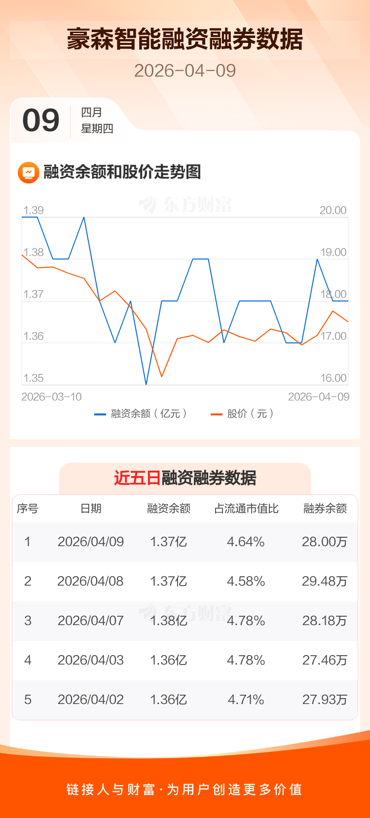 交易所最新数据显示,豪森智能于2026年4月9日获融资买入343.28万元,融资偿还374.94万元,当日融资净偿还31.66万元。目前,该股融资余额1.37亿,占流通市值比例为4.64%。