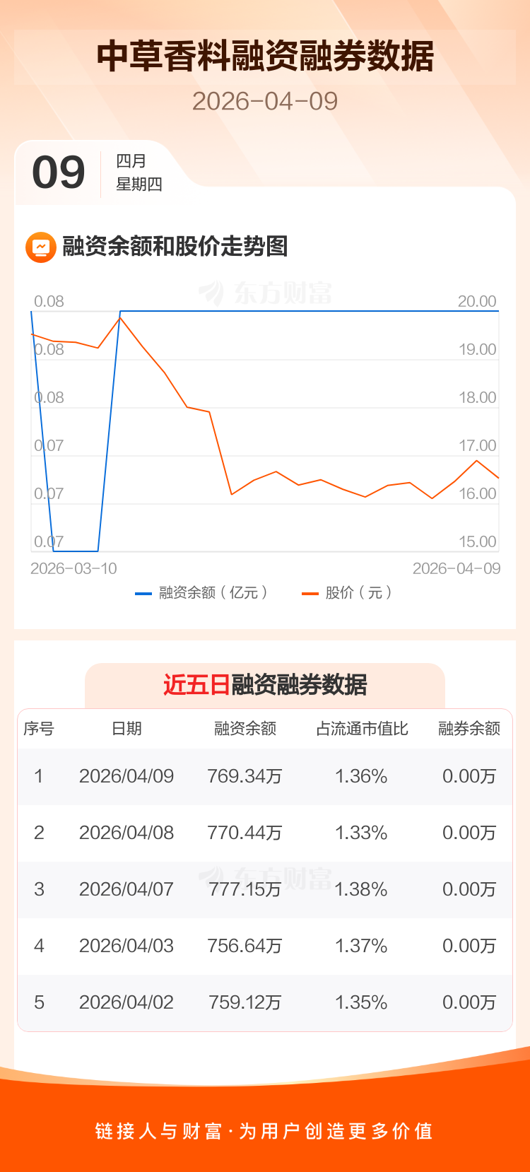 交易所最新数据显示,中草香料于2026年4月9日获融资买入2.65万元,融资偿还3.75万元,当日融资净偿还1.1万元。目前,该股融资余额769.34万,占流通市值比例为1.36%。