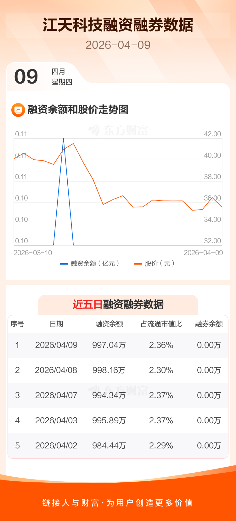 交易所最新数据显示,江天科技于2026年4月9日获融资买入1.42万元,融资偿还2.54万元,当日融资净偿还1.12万元。目前,该股融资余额997.04万,占流通市值比例为2.36%。