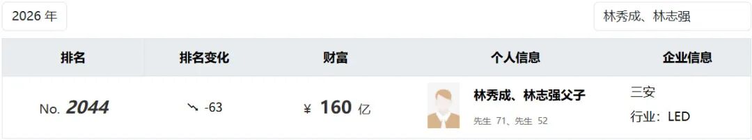 打江山的林秀成,是泉州安溪县人。他曾登顶厦门首富,在《2026胡润全球富豪榜》中,林秀成、林志强父子以160亿元身家,位列厦门上榜富豪第三。