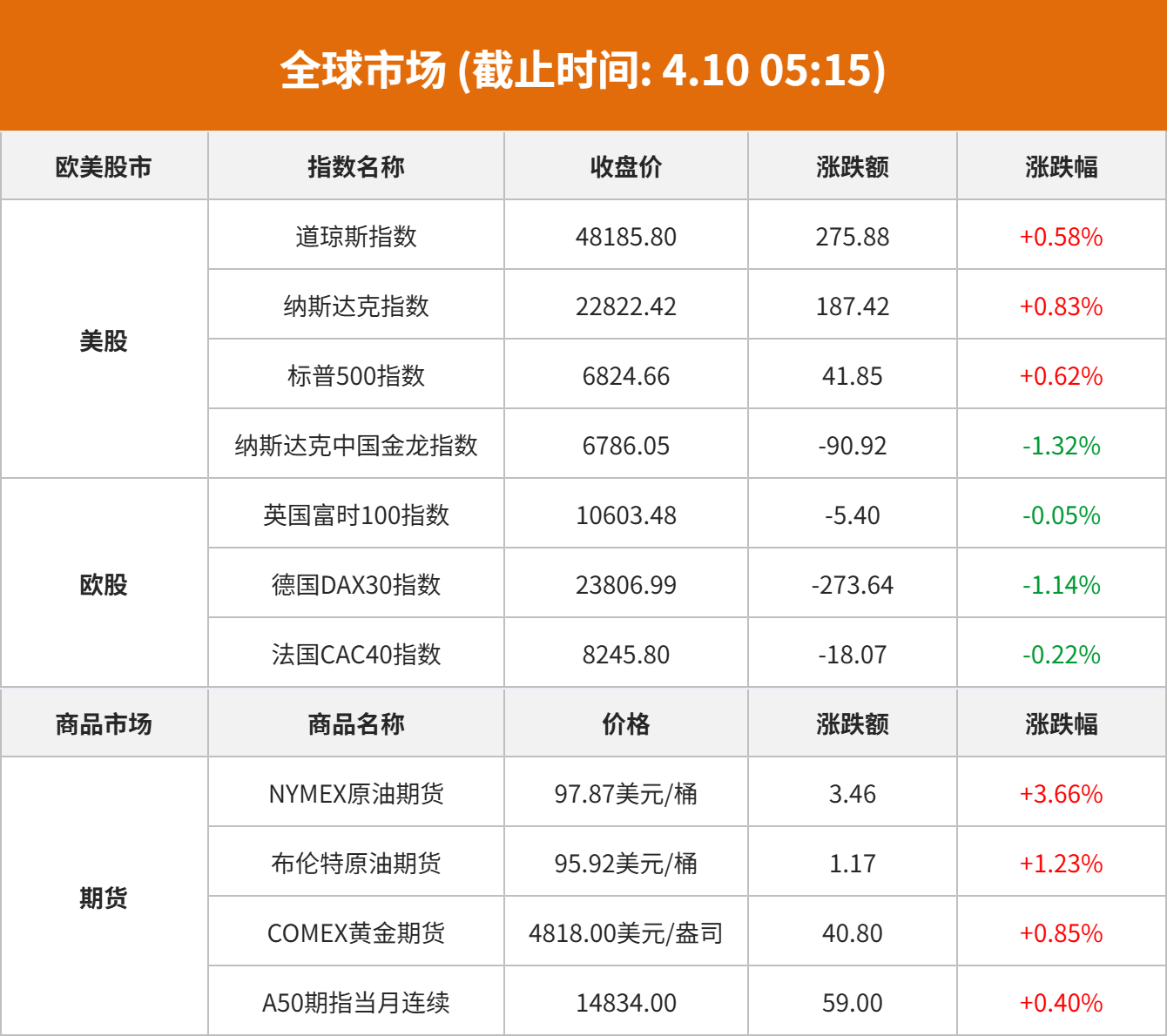 商品市场:国际油价04月09日上涨。截至当天收盘,纽约商品交易所WTI原油期货当月连续合约上涨3.57美元,收于每桶97.98美元,涨幅为3.78%。COMEX黄金期货当月连续合约上涨13.30美元,涨幅0.28%,报4790.5美元/盎司。COMEX白银期货当月连续合约上涨0.09美元,涨幅0.12%,报75.475美元/盎司。现货黄金上涨46.30美元,涨幅0.98%,报4765.65美元/盎司。现货白银上涨1.24美元,涨幅1.67%,报75.33美元/盎司。