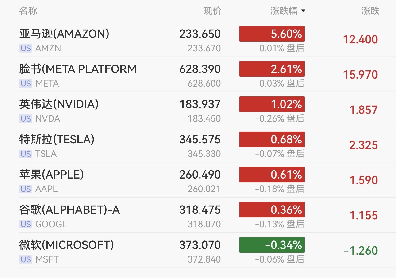 龙头科技股普遍收高。奈飞涨2.72%,Meta涨2.61%,英伟达涨1.02%,特斯拉涨0.68%,苹果涨0.61%,谷歌母公司Alphabet涨0.36%,微软逆势下跌0.34%。