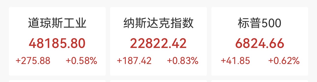 截至收盘,道指涨275.88点,涨幅0.58%,收于48185.80点。纳指涨187.42点,涨幅0.83%,收于22822.42点。标普500指数涨41.85点,涨幅0.62%,收于6824.66点。道指年内由跌转涨,收复今年以来失地,累计上涨0.25%。