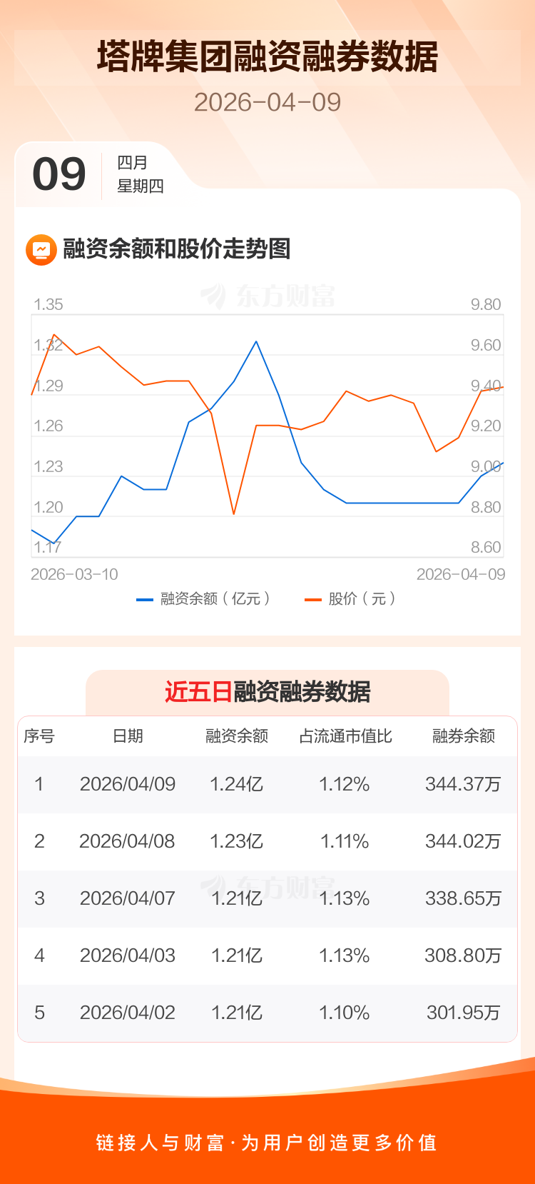 交易所最新数据显示,塔牌集团于2026年4月9日获融资买入438.35万元,融资偿还389.13万元,当日融资净买入49.22万元。目前,该股融资余额1.24亿,占流通市值比例为1.12%。