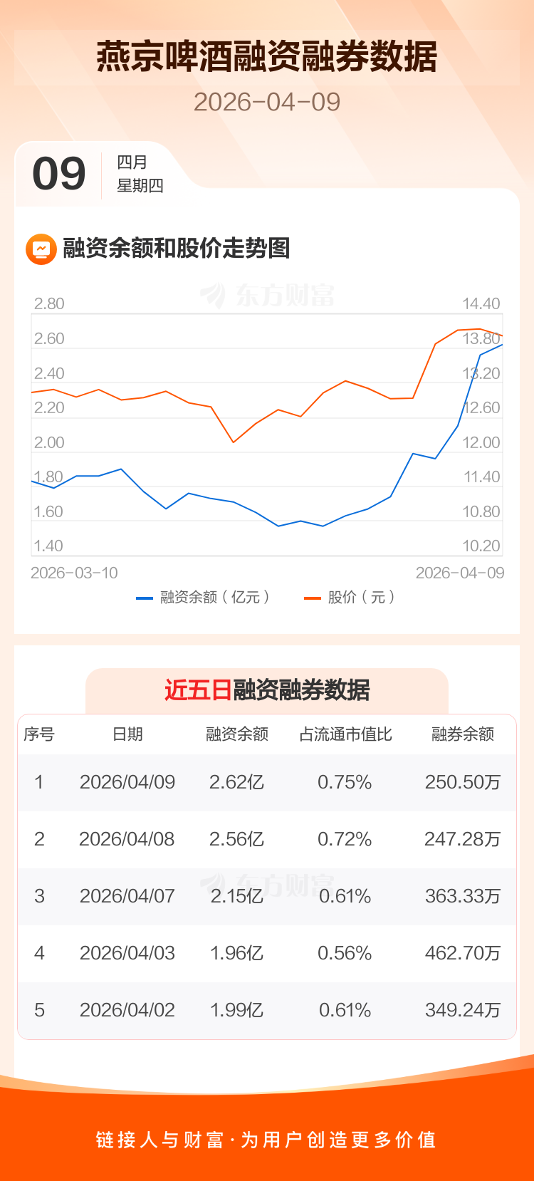 交易所最新数据显示,燕京啤酒于2026年4月9日获融资买入7422.66万元,融资偿还6834.97万元,当日融资净买入587.69万元。目前,该股融资余额2.62亿,占流通市值比例为0.75%。