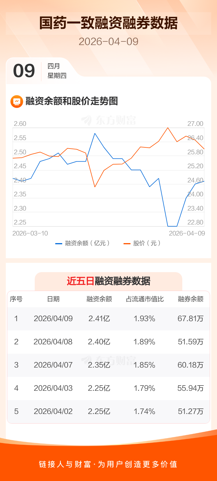 交易所最新数据显示,国药一致于2026年4月9日获融资买入2366.07万元,融资偿还2229.08万元,当日融资净买入136.99万元。目前,该股融资余额2.41亿,占流通市值比例为1.93%。