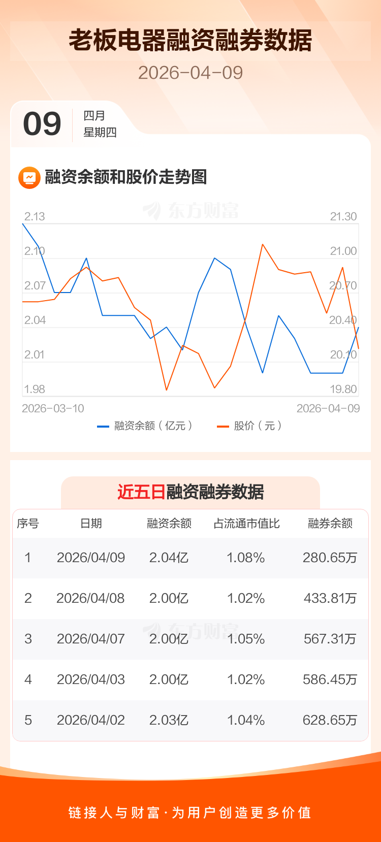 交易所最新数据显示,老板电器于2026年4月9日获融资买入967.36万元,融资偿还575.50万元,当日融资净买入391.86万元。目前,该股融资余额2.04亿,占流通市值比例为1.08%。