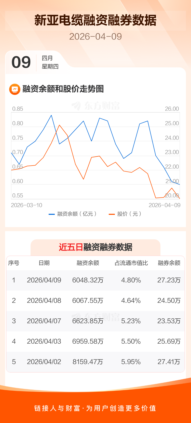 交易所最新数据显示,新亚电缆于2026年4月9日获融资买入1036.70万元,融资偿还1055.93万元,当日融资净偿还19.23万元。目前,该股融资余额6048.32万,占流通市值比例为4.80%。