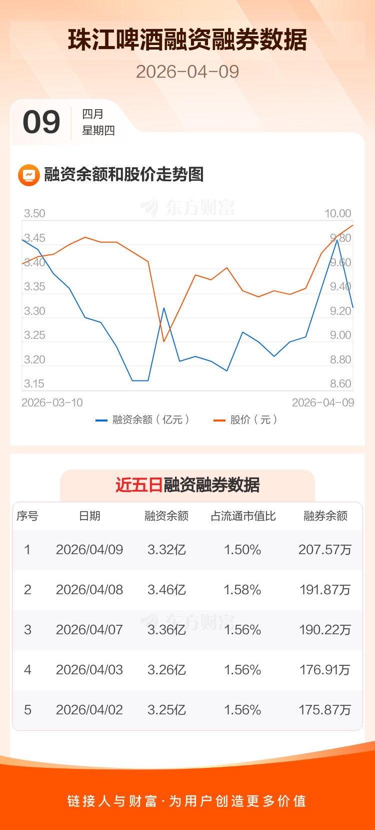 交易所最新数据显示,珠江啤酒于2026年4月9日获融资买入1662.15万元,融资偿还3052.08万元,当日融资净偿还1389.93万元。目前,该股融资余额3.32亿,占流通市值比例为1.50%。
