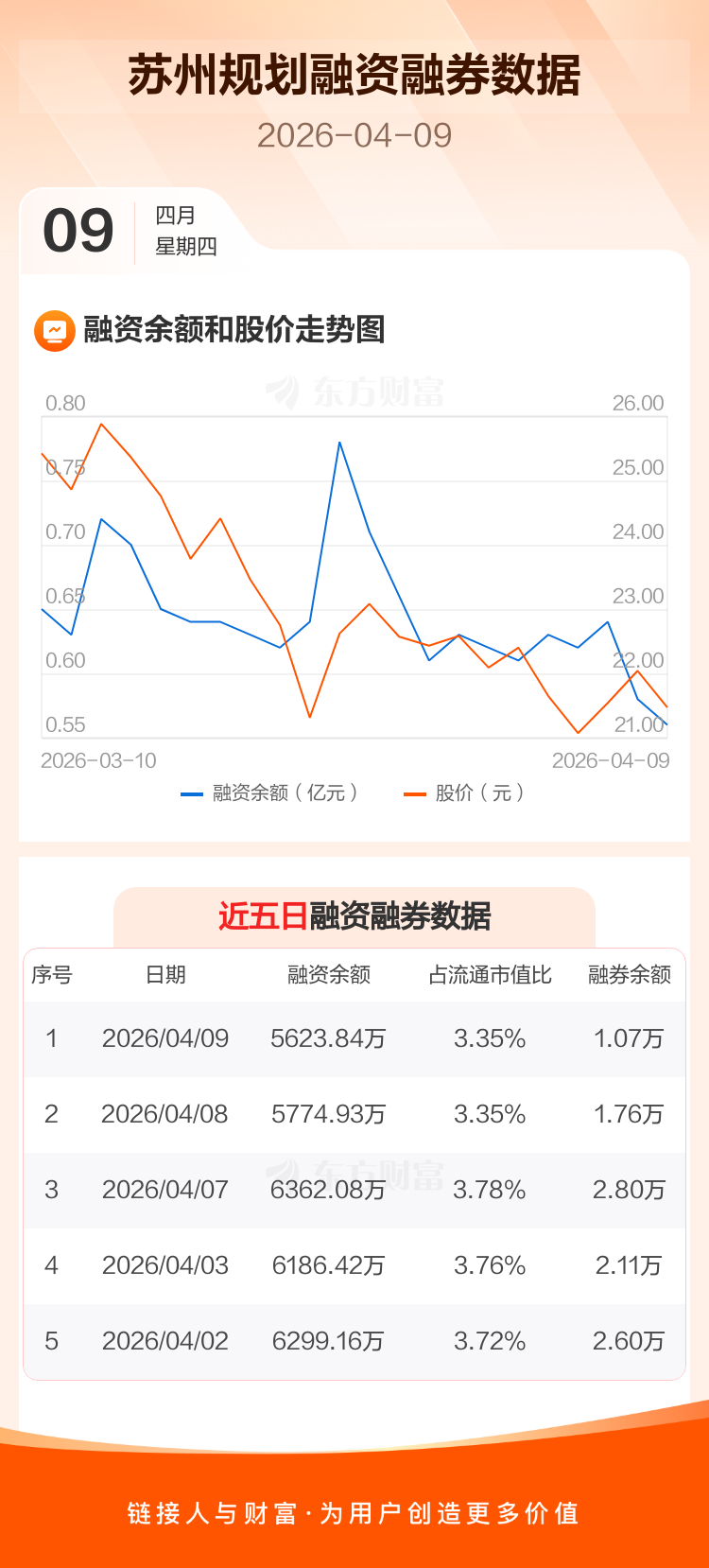 交易所最新数据显示,苏州规划于2026年4月9日获融资买入391.42万元,融资偿还542.51万元,当日融资净偿还151.09万元。目前,该股融资余额5623.84万,占流通市值比例为3.35%。