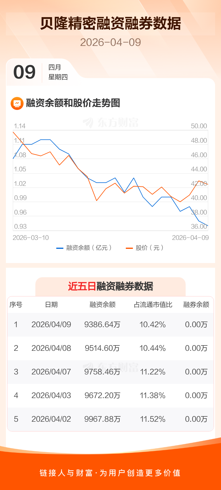 交易所最新数据显示,贝隆精密于2026年4月9日获融资买入334.50万元,融资偿还462.46万元,当日融资净偿还127.96万元。目前,该股融资余额9386.64万,占流通市值比例为10.42%。