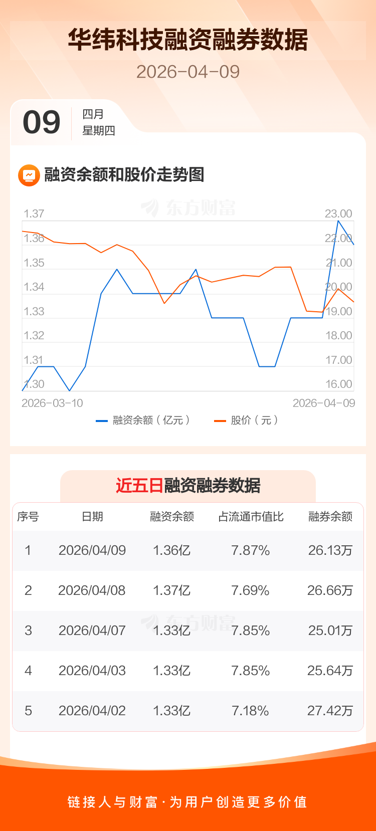 交易所最新数据显示,华纬科技于2026年4月9日获融资买入392.56万元,融资偿还447.03万元,当日融资净偿还54.46万元。目前,该股融资余额1.36亿,占流通市值比例为7.87%。