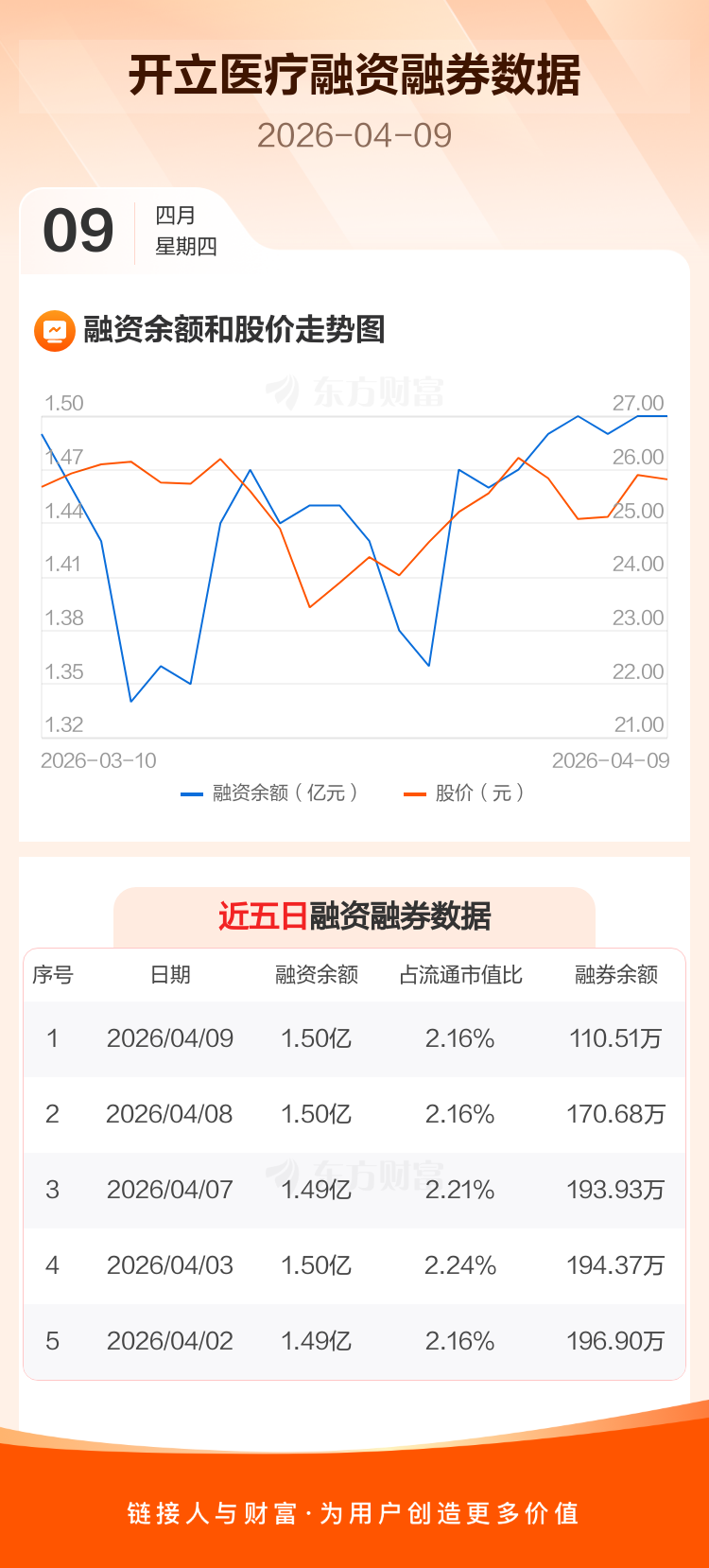 交易所最新数据显示,开立医疗于2026年4月9日获融资买入312.88万元,融资偿还372.93万元,当日融资净偿还60.05万元。目前,该股融资余额1.50亿,占流通市值比例为2.16%。