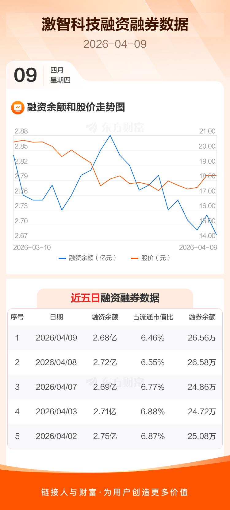 交易所最新数据显示,激智科技于2026年4月9日获融资买入627.37万元,融资偿还1017.69万元,当日融资净偿还390.31万元。目前,该股融资余额2.68亿,占流通市值比例为6.46%。