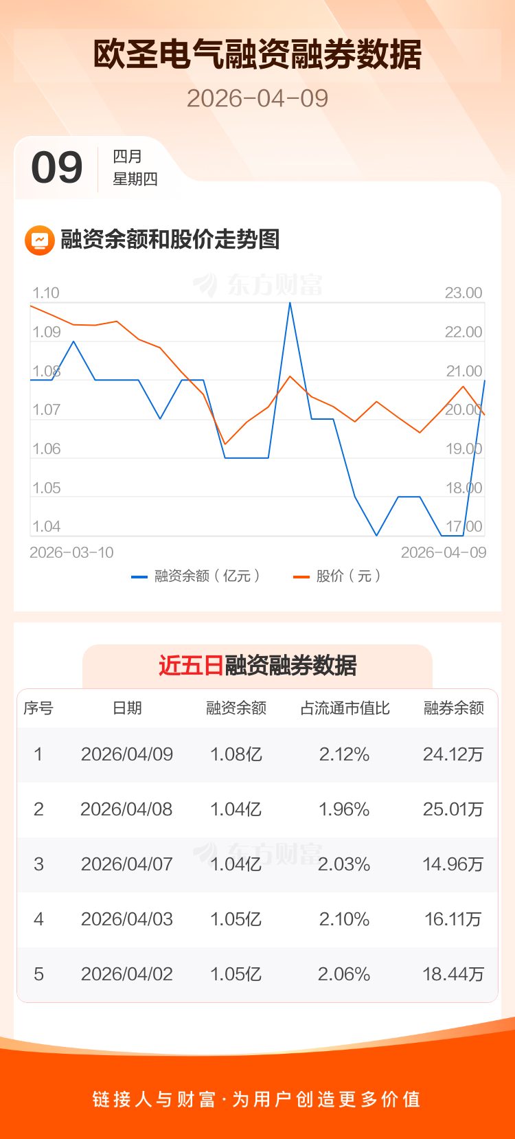交易所最新数据显示,欧圣电气于2026年4月9日获融资买入951.58万元,融资偿还523.75万元,当日融资净买入427.83万元。目前,该股融资余额1.08亿,占流通市值比例为2.12%。