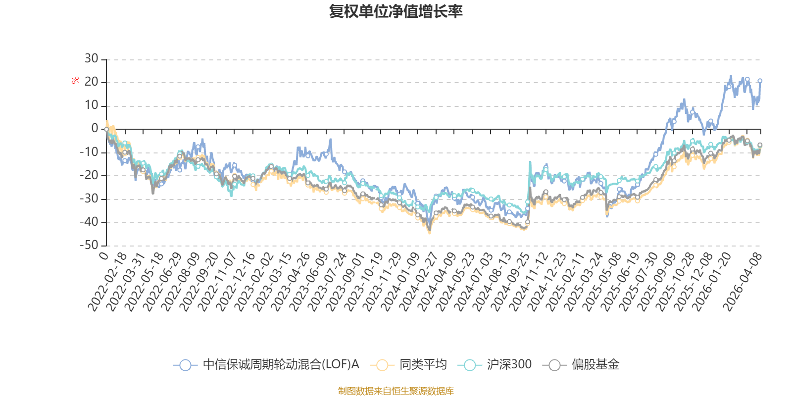 截至4月8日,中信保诚周期轮动混合(LOF)A近三个月复权单位净值增长率为5.72%,位于同类可比基金40/265;近半年复权单位净值增长率为8.70%,位于同类可比基金66/265;近一年复权单位净值增长率为94.12%,位于同类可比基金15/265;近三年复权单位净值增长率为30.54%,位于同类可比基金81/261。