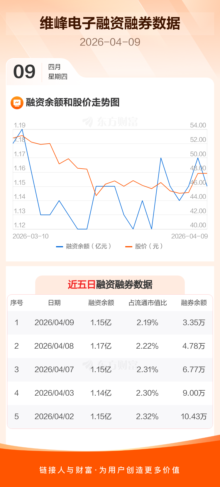 交易所最新数据显示,维峰电子于2026年4月9日获融资买入169.75万元,融资偿还316.50万元,当日融资净偿还146.75万元。目前,该股融资余额1.15亿,占流通市值比例为2.19%。