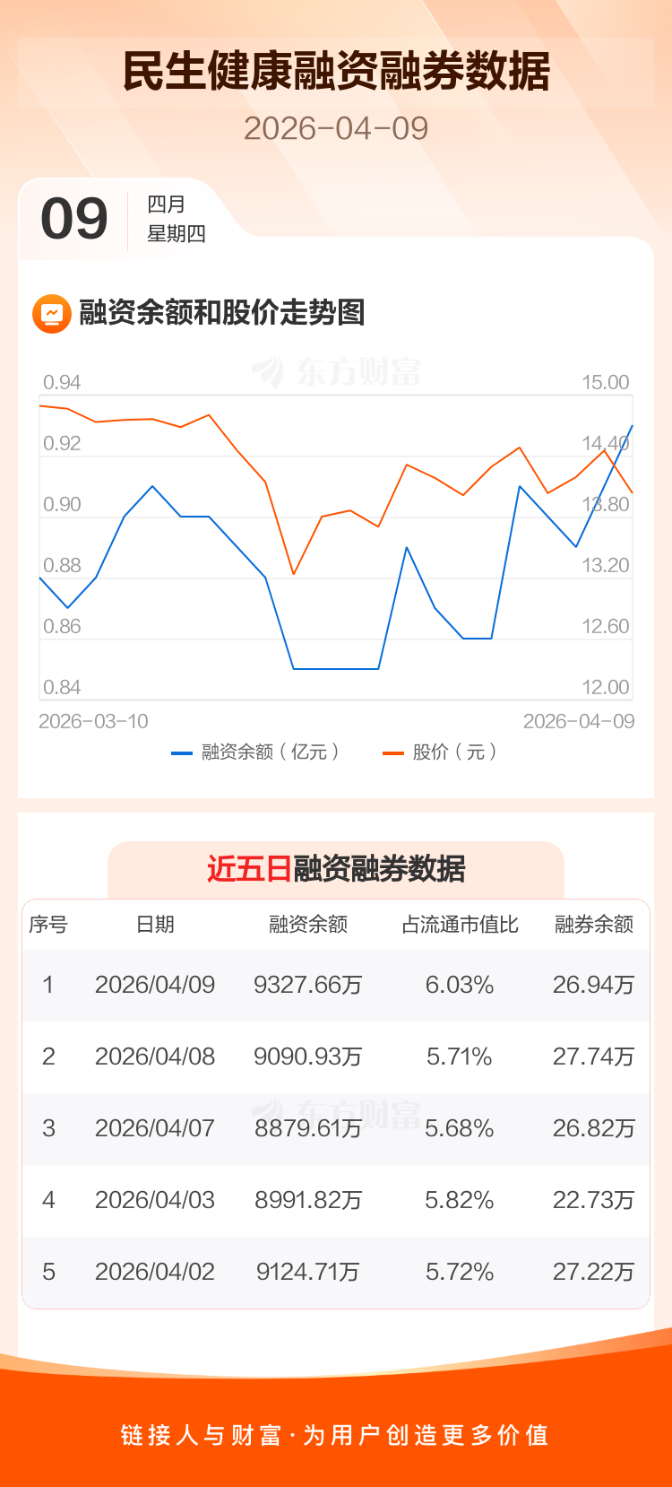 交易所最新数据显示,民生健康于2026年4月9日获融资买入552.71万元,融资偿还315.97万元,当日融资净买入236.74万元。目前,该股融资余额9327.66万,占流通市值比例为6.03%。