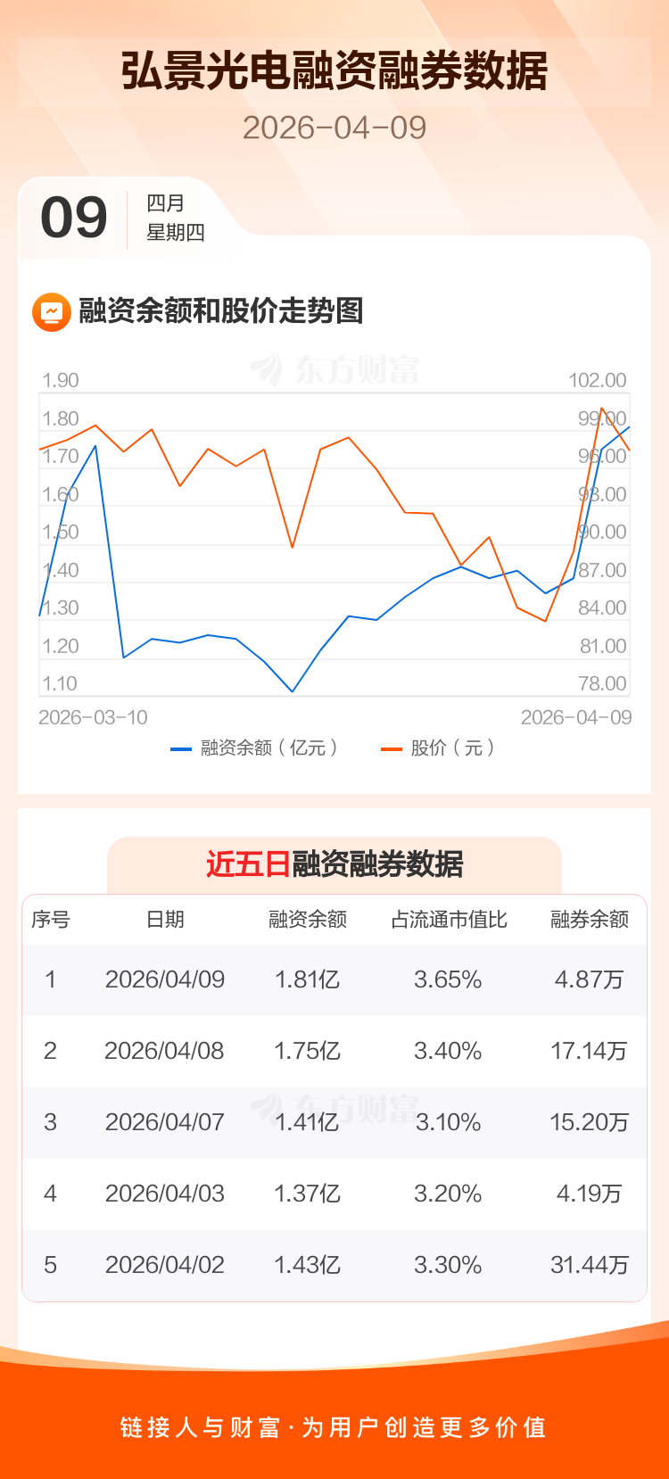 交易所最新数据显示,弘景光电于2026年4月9日获融资买入2572.31万元,融资偿还1920.35万元,当日融资净买入651.96万元。目前,该股融资余额1.81亿,占流通市值比例为3.65%。