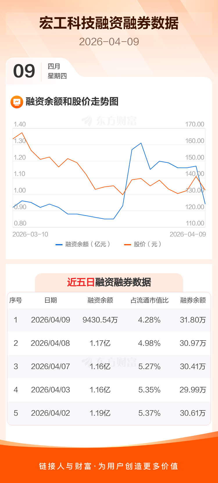 交易所最新数据显示,宏工科技于2026年4月9日获融资买入1383.52万元,融资偿还3610.58万元,当日融资净偿还2227.06万元。目前,该股融资余额9430.54万,占流通市值比例为4.28%。
