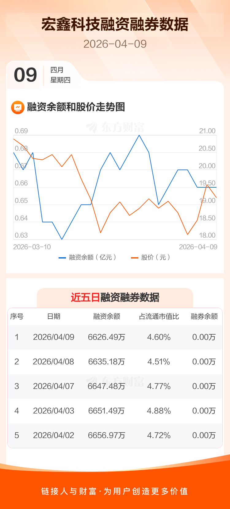 交易所最新数据显示,宏鑫科技于2026年4月9日获融资买入435.40万元,融资偿还444.09万元,当日融资净偿还8.69万元。目前,该股融资余额6626.49万,占流通市值比例为4.60%。