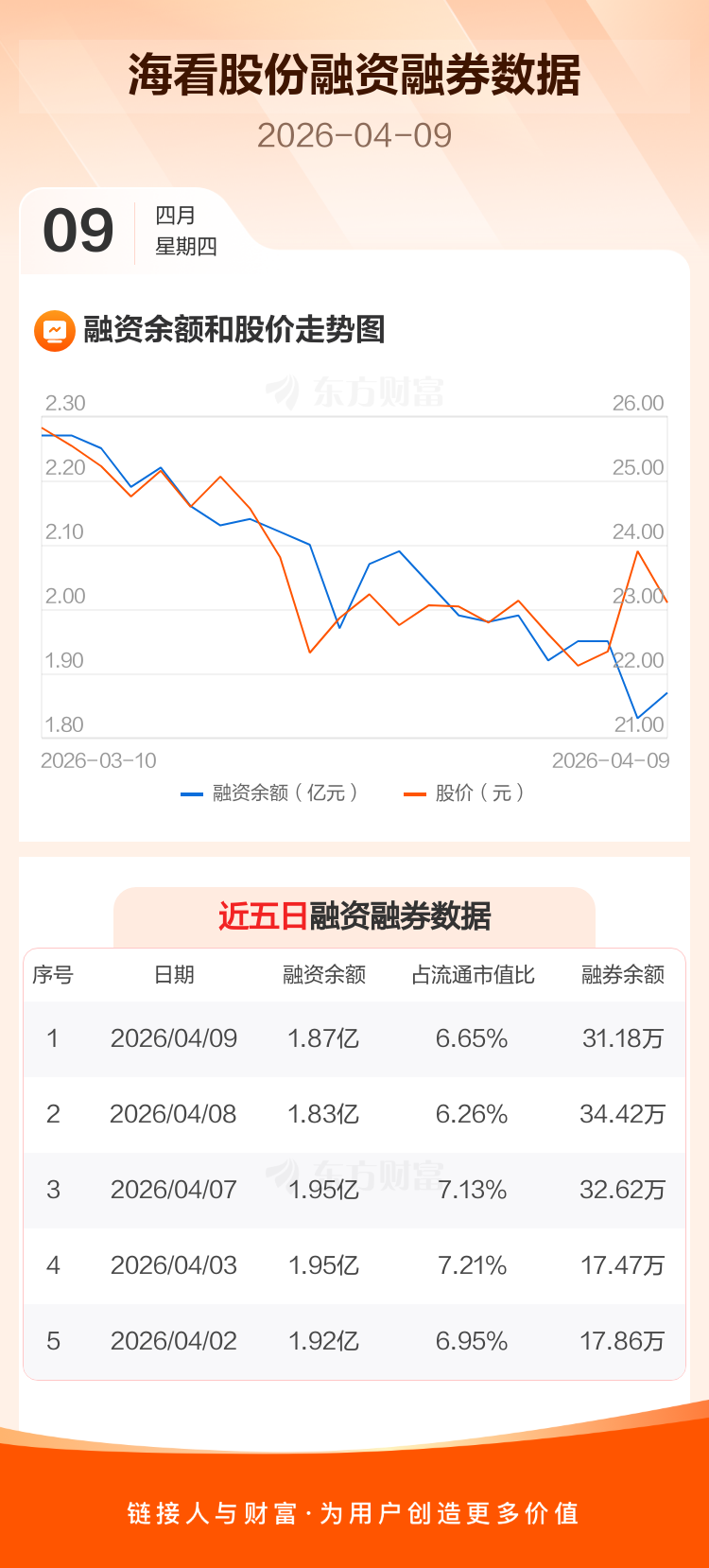 交易所最新数据显示,海看股份于2026年4月9日获融资买入1492.57万元,融资偿还1021.35万元,当日融资净买入471.22万元。目前,该股融资余额1.87亿,占流通市值比例为6.65%。