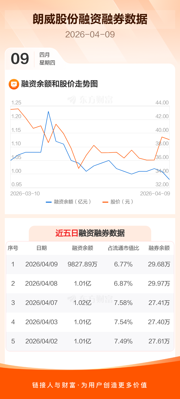 交易所最新数据显示,朗威股份于2026年4月9日获融资买入424.30万元,融资偿还675.56万元,当日融资净偿还251.26万元。目前,该股融资余额9827.89万,占流通市值比例为6.77%。