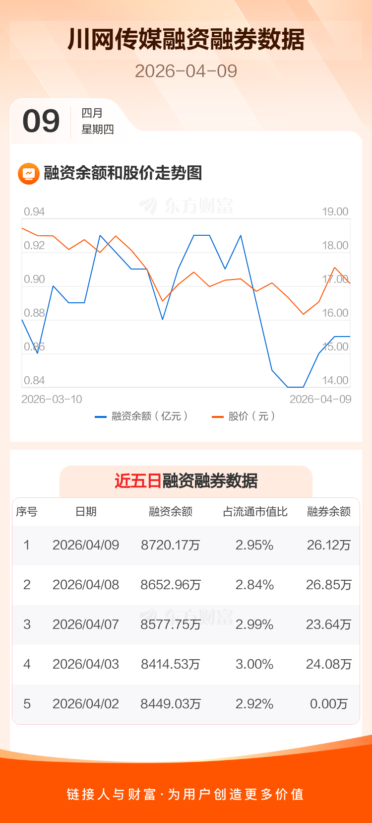 交易所最新数据显示,川网传媒于2026年4月9日获融资买入526.14万元,融资偿还458.94万元,当日融资净买入67.21万元。目前,该股融资余额8720.17万,占流通市值比例为2.95%。