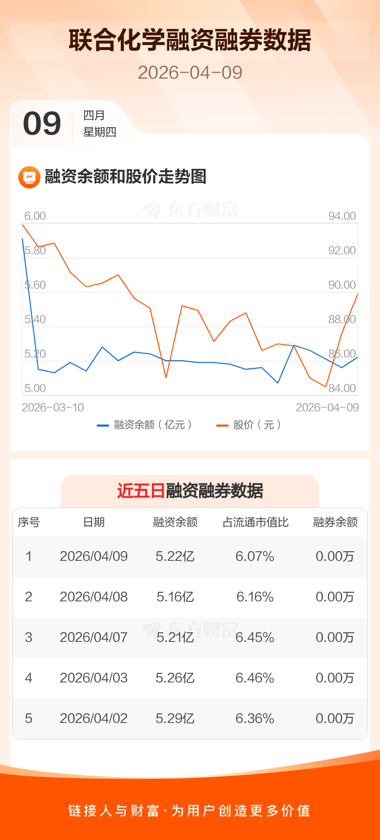 交易所最新数据显示,联合化学于2026年4月9日获融资买入2140.20万元,融资偿还1558.26万元,当日融资净买入581.93万元。目前,该股融资余额5.22亿,占流通市值比例为6.07%。