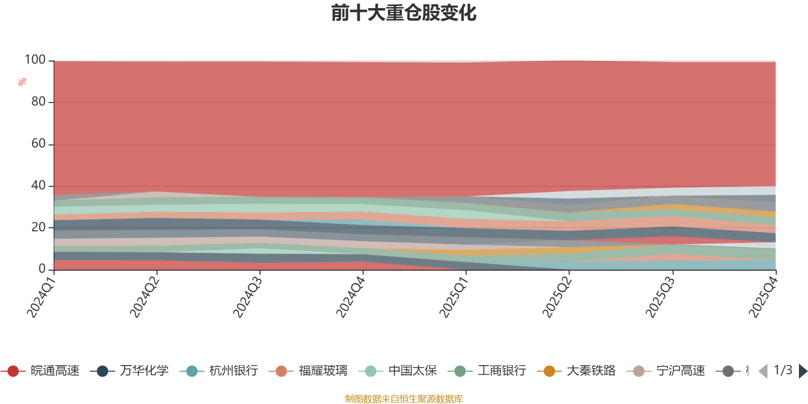 截至2025年末,基金十大重仓股分别是工商银行、杭州银行、招商银行、长江电力、江苏银行、美的集团、交通银行、兴业银行、华泰证券、中国移动。