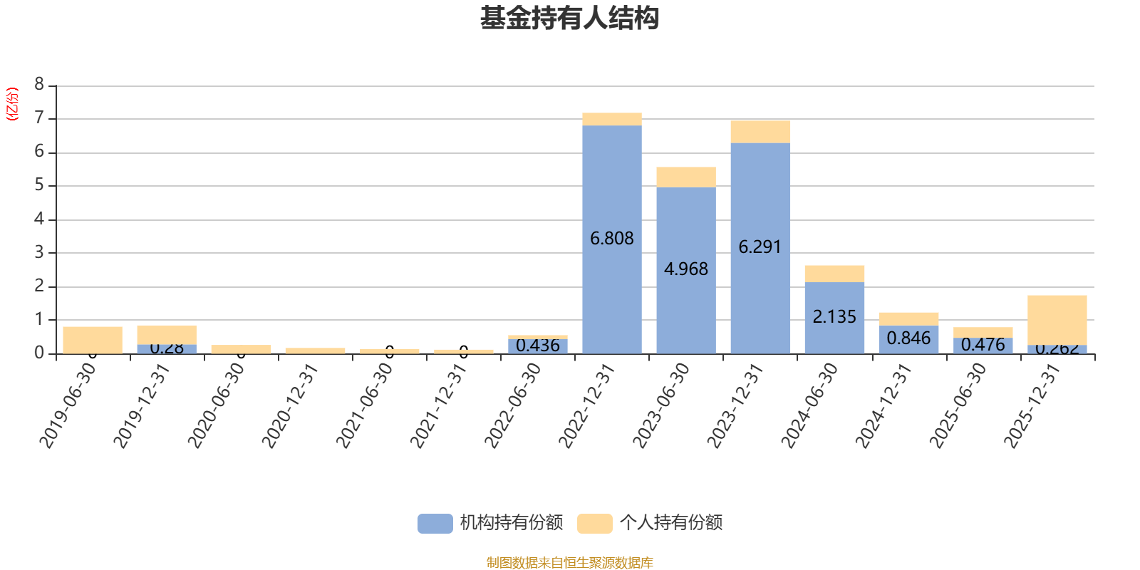 截至2025年12月31日,基金持有人共计2421户,合计持有1.74亿份。其中管理人员工持有174万份,占比1.00%,机构持有份额占比15.07%,个人投资者占比84.93%。
