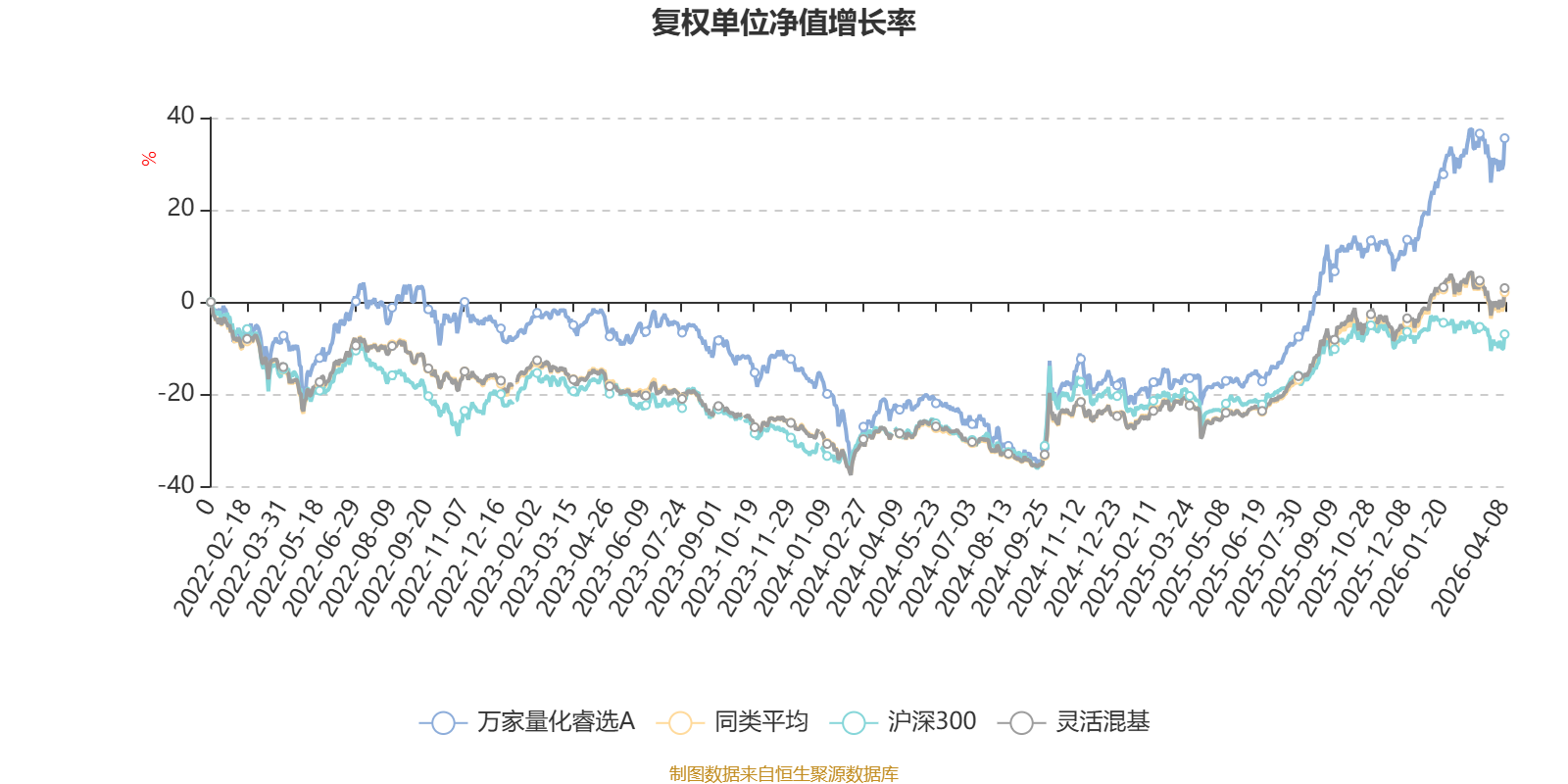 截至4月8日,万家量化睿选A近三个月复权单位净值增长率为9.92%,位于同类可比基金92/1287;近半年复权单位净值增长率为19.45%,位于同类可比基金86/1286;近一年复权单位净值增长率为71.50%,位于同类可比基金193/1286;近三年复权单位净值增长率为37.51%,位于同类可比基金250/1286。