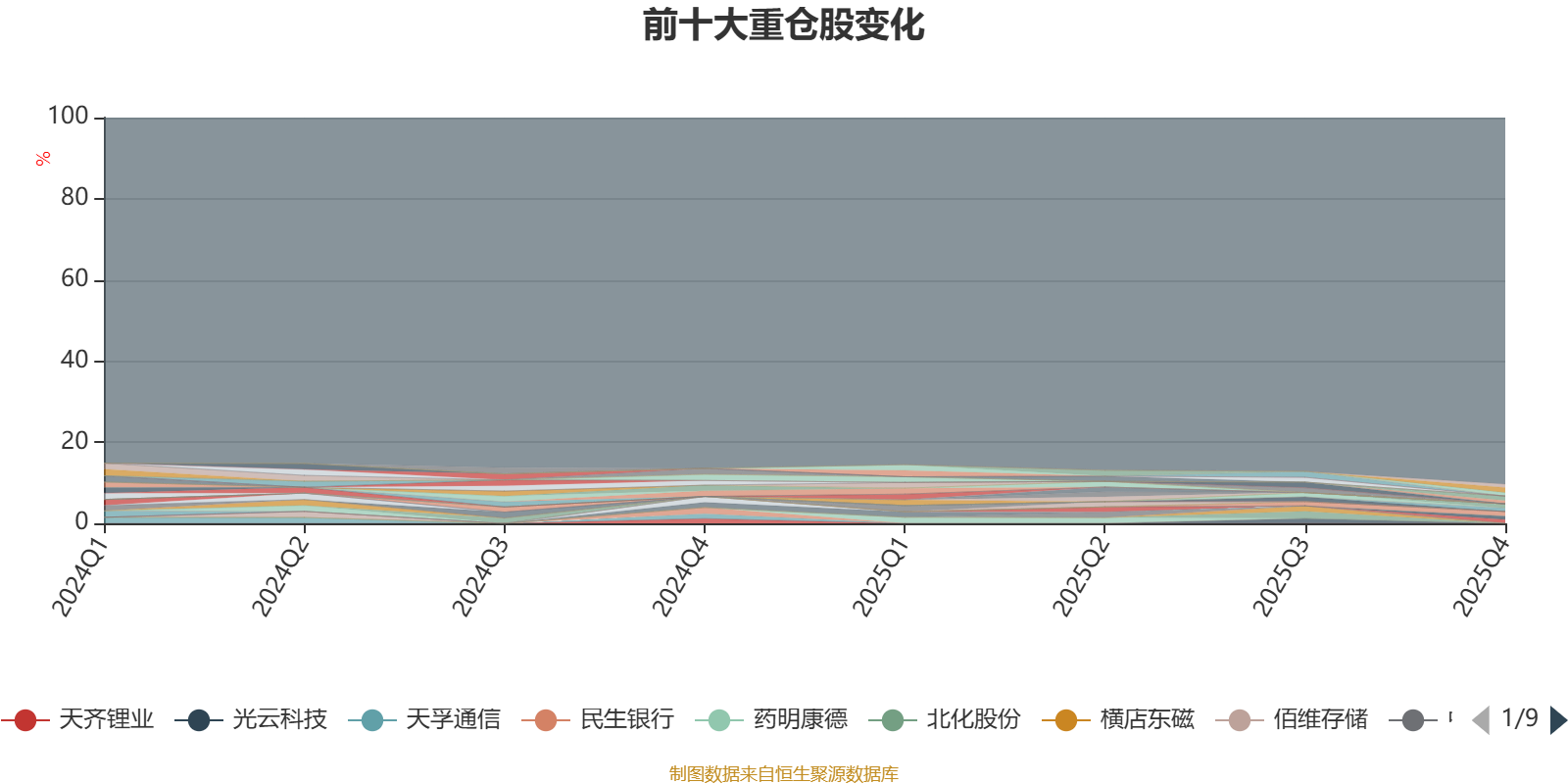 截至2025年末,基金十大重仓股分别是腾远钴业、源杰科技、伟测科技、固德威、北方股份、高德红外、新华保险、华友钴业、紫金矿业、宝丰能源。