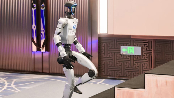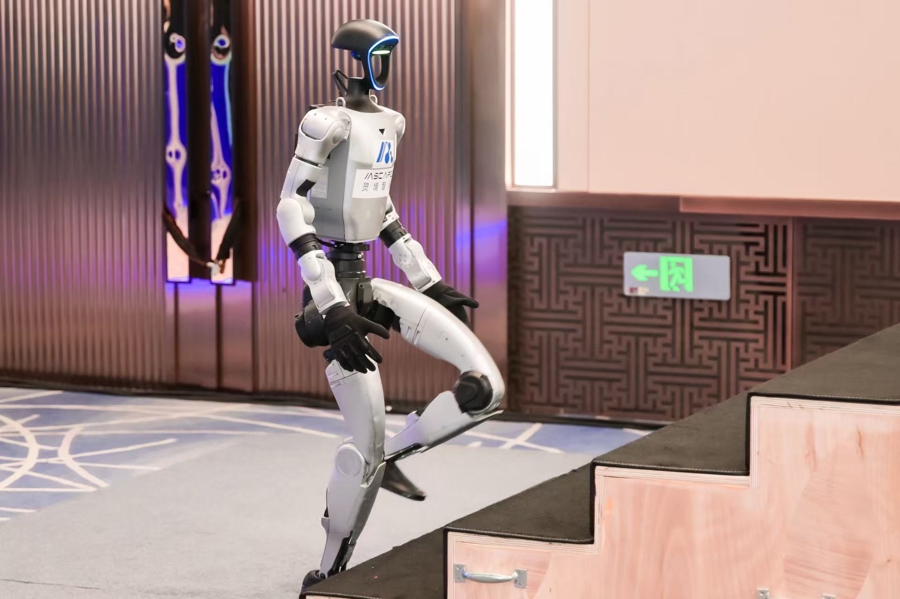 装上灵境智源小脑及自研视觉运控模型的机器人可以像人一样感知楼梯台阶高度和宽度去踏步