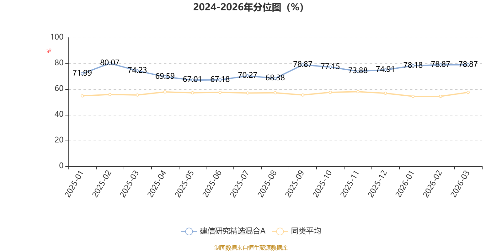 通过所选区间该基金净值增长率分位图,可以观察该基金与同类基金业绩比较情况。图为坐标原点到区间内某时点的净值增长率在同类基金中的分位数。