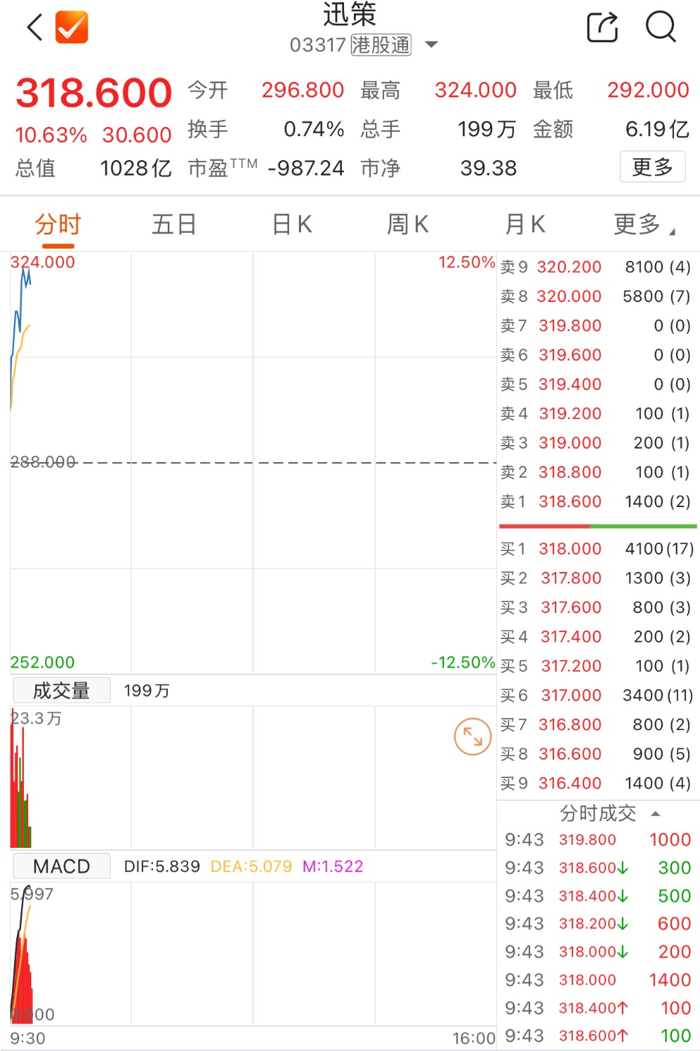 上证报中国证券网讯 4月10日,港股AI应用股走强,截至9时43分,迅策涨超10%,商汤-W涨超4%,金山云涨超3%。