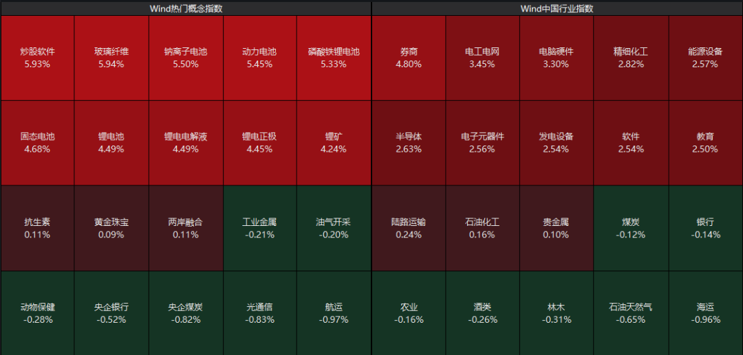 券商、电网、化工、半导体、航天军工等概念大涨。海运、石油天然气、酒类、通信设备、光通信、光模块等跌幅居前。