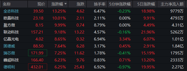 半导体概念中,联动科技盘中涨超10%,欧晶科技、盈方微涨停,瑞芯微、芯原股份、兆易创新等涨幅居前。