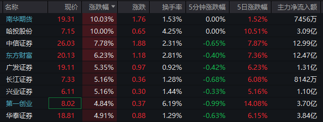 券商等权概念大涨,南华期货、哈投股份涨停,中信证券盘中涨超9%,东方财富涨超7%,华泰证券、广发证券、长江证券等涨幅居前。