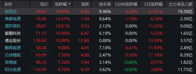 储能概念今日大爆发,欣旺达19.99%涨停,国轩高科、豪鹏科技、德业股份、石大胜华涨停,固德威、南都电源、鹏辉能源、亿纬锂能、阳光电源等大涨。宁德时代涨超4%。