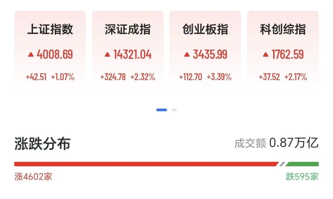 截至10:00左右,上证指数拉升涨超1%,时隔14个交易日重回4000点,创业板指涨逾3%,再度刷新2021年12月底以来的阶段新高,科创综指、深圳成指涨超2%,市场超4600股上涨。