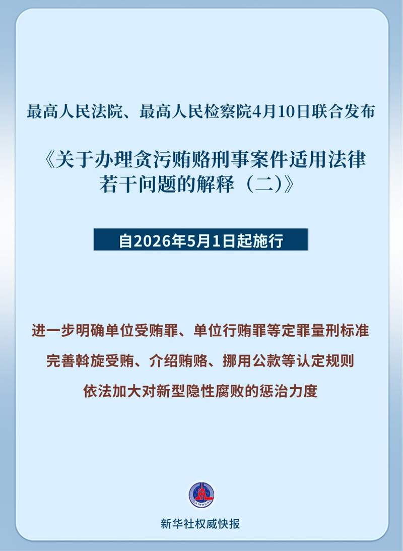 据新华社消息,最高人民法院、最高人民检察院4月10日联合发布《关于办理贪污贿赂刑事案件适用法律若干问题的解释(二)》,自2026年5月1日起施行。