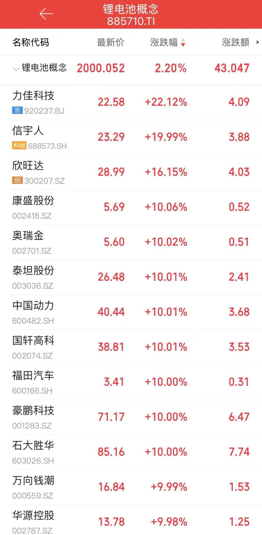 4月10日,A股锂电板块再度迎来高光时刻。早盘锂电池产业链全线震荡拉升,信宇人、康盛股份、奥瑞金、泰坦股份、国轩高科等十余股封上涨停板,天华新能、鹏辉能源、德赛电池等跟随上涨。