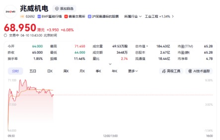 上证报中国证券网讯(李子健记者周亮)4月10日,兆威机电H股股价一度涨超9%,截至10时43分,公司股价上涨6.08%。