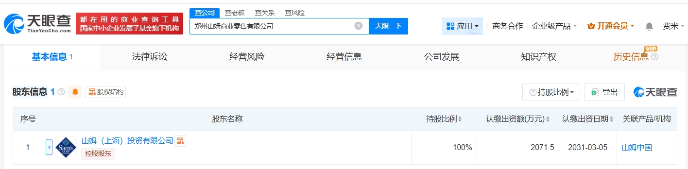 【大河财立方消息】天眼查App显示,近日,郑州山姆商业零售有限公司成立,法定代表人为郑硕怀,注册资本2071.5万人民币,经营范围包括食品销售、食品互联网销售、日用百货销售等,由山姆(上海)投资有限公司全资持股。