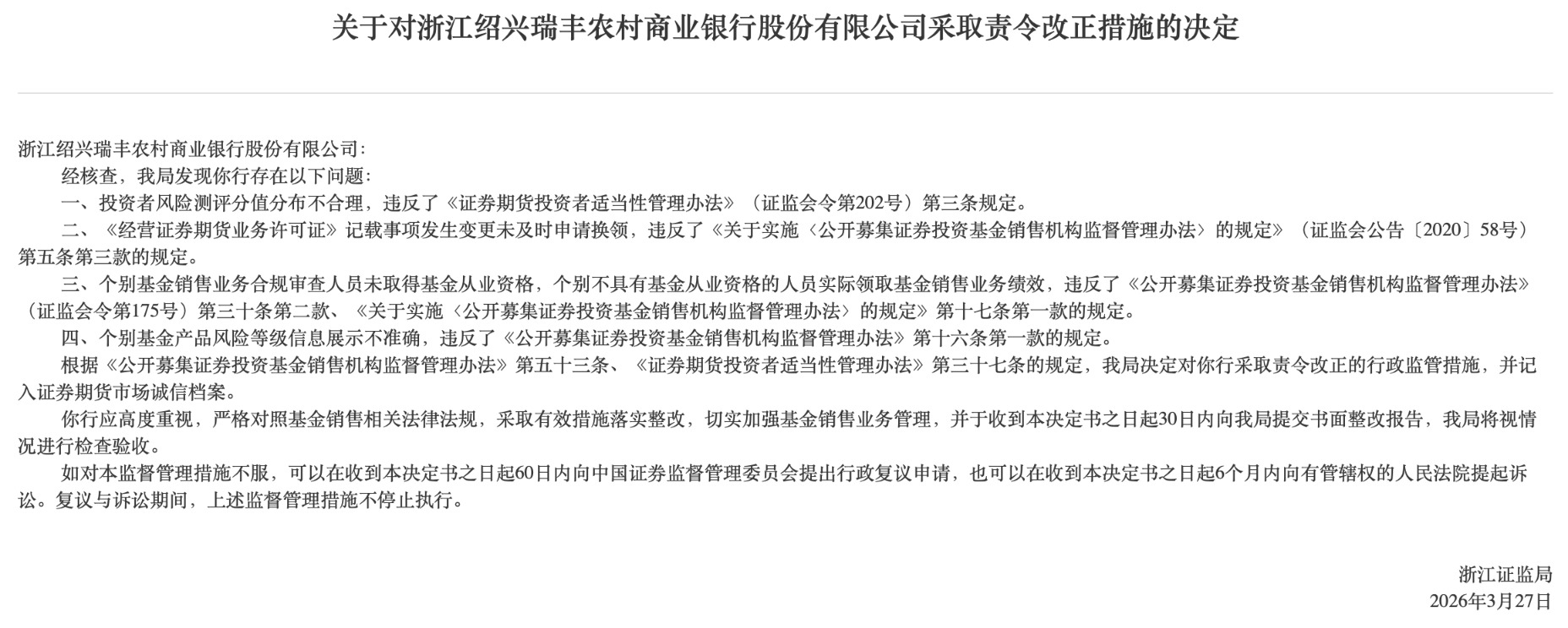 浙江证监局4月10日公告,对浙江绍兴瑞丰农村商业银行股份有限公司采取责令改正措施。