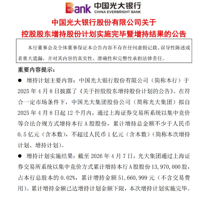 值得注意的是,同日光大银行还披露,光大集团拟自2026年4月8日起的12个月内增持本行A股0.5亿至1亿元;截至2026年4月7日,光大集团已累计增持光大银行1397万股(占总股本0.02%),累计增持金额达5166.1万元,达计划下限,增持后光大集团持股比例增至47.42%。